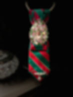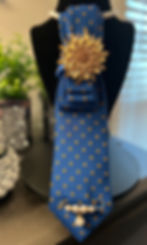 Navy blue and green tie featuring a dramatic emerald jeweled brooch