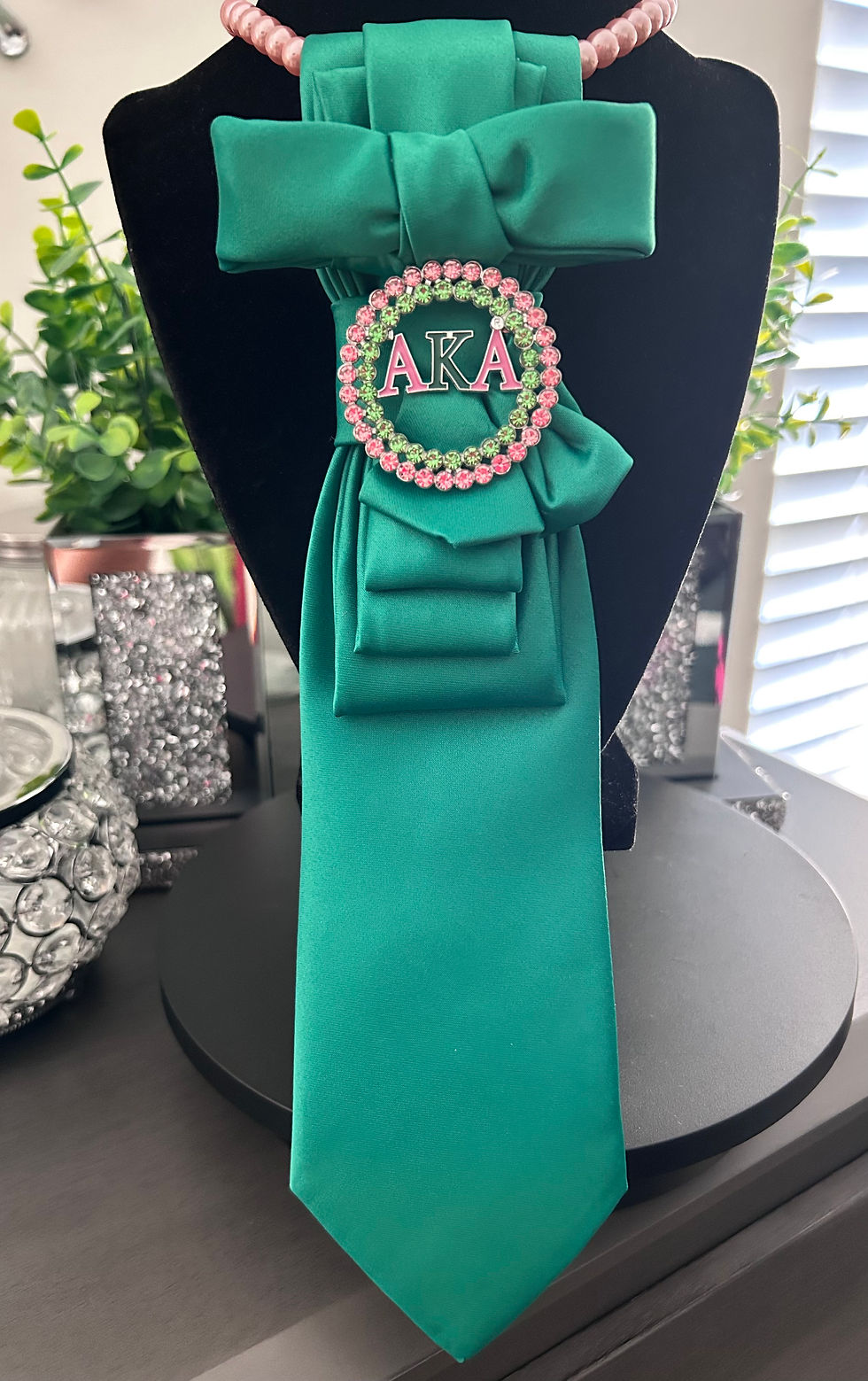 Navy blue and green tie featuring a dramatic emerald jeweled brooch